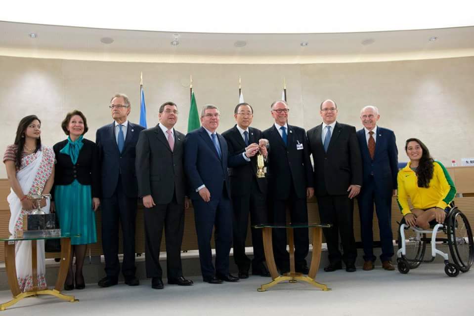 Her speech was part of an event that took place during the Olympic Flame’s stopover at the United Nations Offices in Geneva en route to its final destination, Rio de Janeiro. At the same ceremony, the IOC’s Bach presented the Olympic Cup to the UN’s Ban, who accepted the award on behalf of his organization.