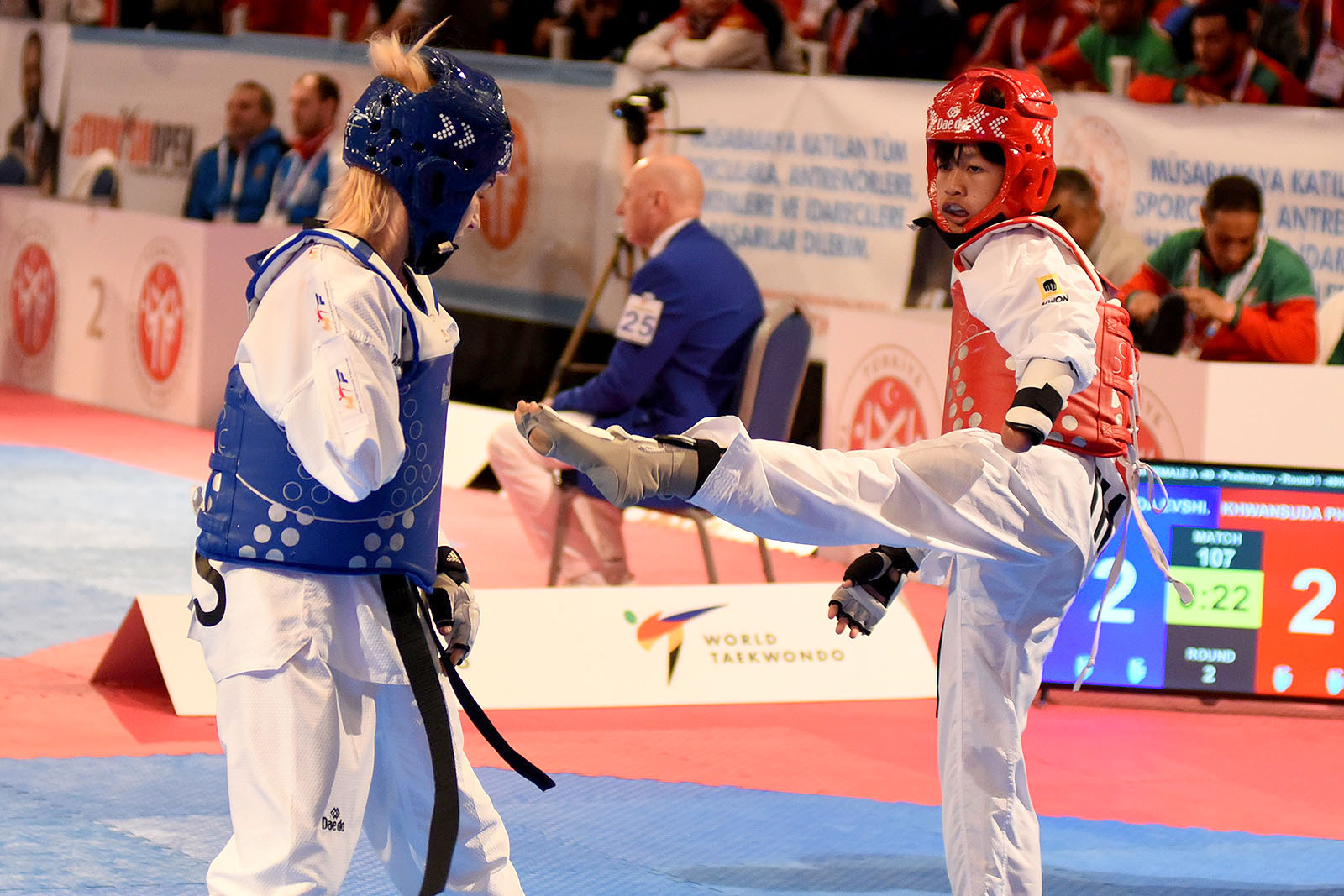Phuangkitcha capped her first world championship after Mongolia’s top-ranked Enkhtuya Khurelbaatar was disqualified for an illegal kick.