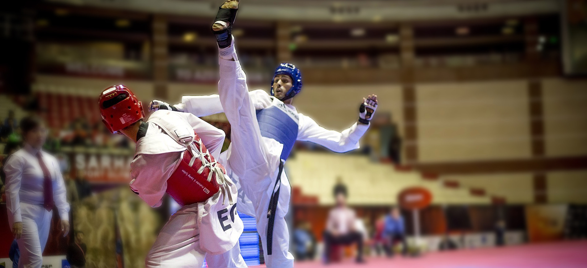 Both fighters started fast, exchanging kick-for-kick as they tried to dominate the center of the ring. This was stylish stuff, with Kim shooting powerful looking round kicks and Navarro unleashing a whiplash reverse turning kick that – had it connected – would have severed Kim’s head. Remarkably, the round ended scoreless. Round 2 saw more tactical play in center of the mats and again the Mexican firing off deadly looking techniques. Both were fighting with no-holds-barred power kicks, but neither was landing. At the end of the round, the board remained stubbornly empty, in defiance of the quality of play from both fighters.