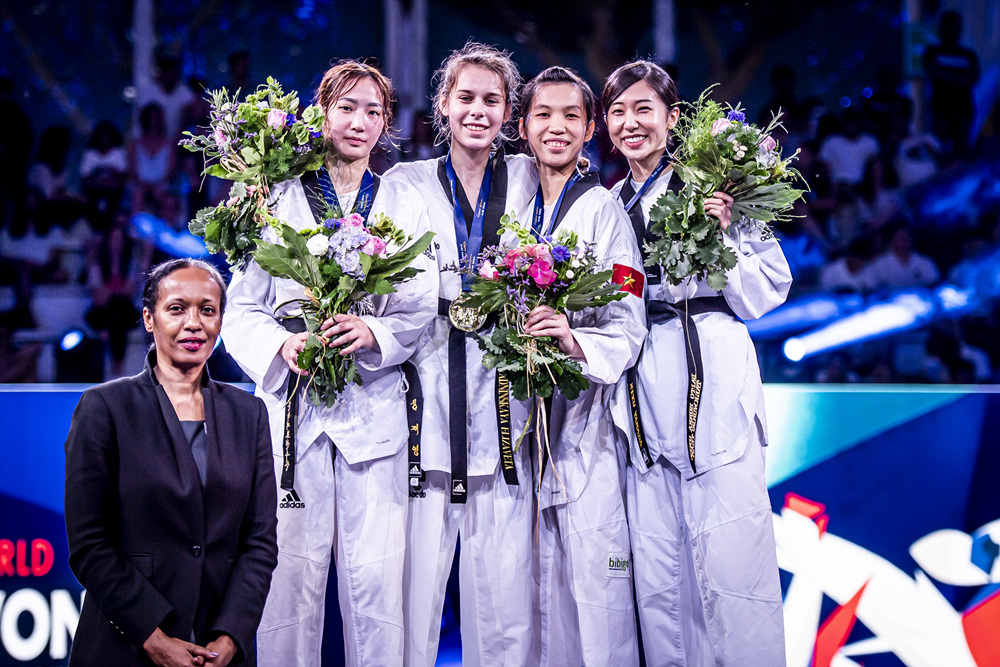 The bronze medals went to Miyu Yamada of Japan and Thailand’s Thi Kim Tuyen Truong. Yamada and Ryadninskaya faced each other in the first of the semi-finals. A thrilling final 10 seconds of the match saw both fighters take the lead only for Ryadninskaya to land a last second kick to win 11-10. Sim and Truong met in the second semi final with Sim dominating the opening rounds and establishing an unassailable lead as she won 13-3.