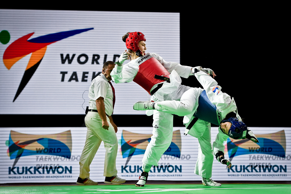 In the first semifinal of the category, European Champion Tatiana Kudashova of Russia took on World Champion and Grand Slam gold medalist Irem Yaman of Turkey. The first round was slow, with the referee calling for action. In the second, the Russian scored to the head for a three-point lead, and suddenly it was game on. Yaman attacked with head kicks; Russian scored again to the body; then the Turk finally landed an arching kick to the head. The round ended 7-3 to Kudashova. In the third, Yaman scored with a cut kick to the body, but was penalized for pushing on the edge of the mats. Kudashova ducked under Yaman’s high kicks – but then she connected to Kudashova’s head. Score: 10-10. Almost as soon as the round started, Yaman struck decisively with a cut kick for the win and a place in the finals.