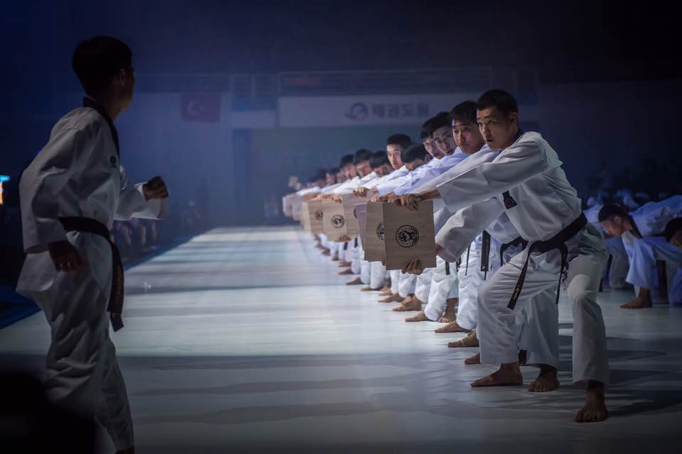 In black, white and colored doboks, they performed group poomsae that ran like a marital kaleidoscope, then a flying series of non-stop kick breaks. Funkier stuff followed: Taekwondo dance, set to thumping electronic rock. Next: Traditional group poomsae and sky-high breaks, followed by power breaks.