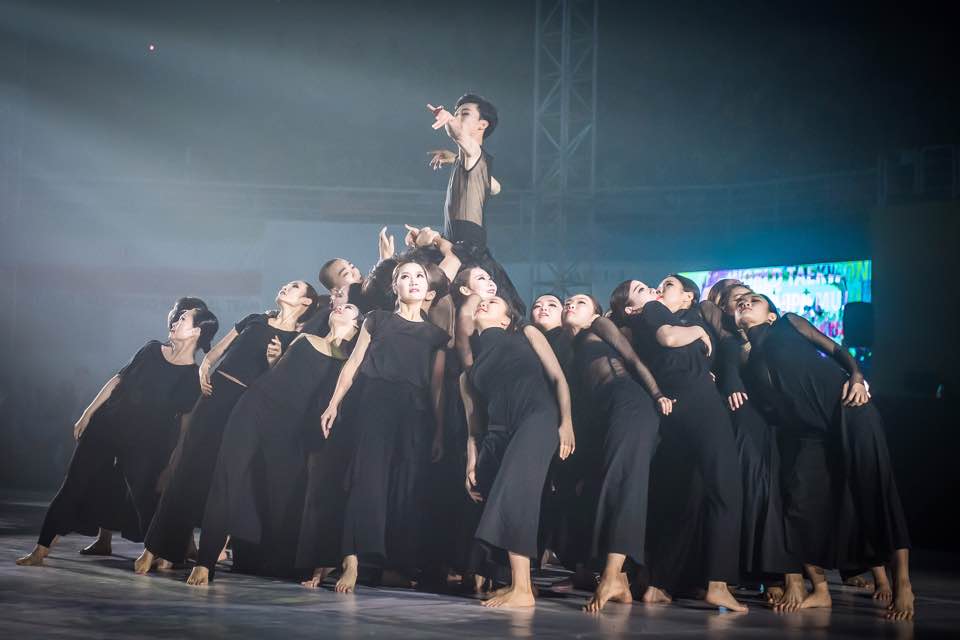 This was followed by a group taekwondo performance, serenaded by a troupe of traditional percussionists whose thunderous rhythm set the tempo for their punches and kicks. It concluded with what may well be a world record of serial jump spinning kick breaks along the length of the stadium floor. Next was more taekwondo-themed dance and a fan dance set to, inevitably, the Korean folk tune “Arirang.”