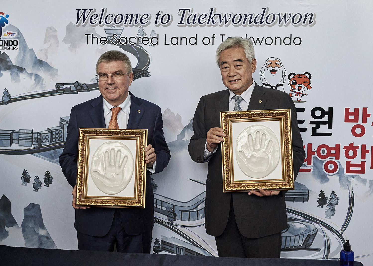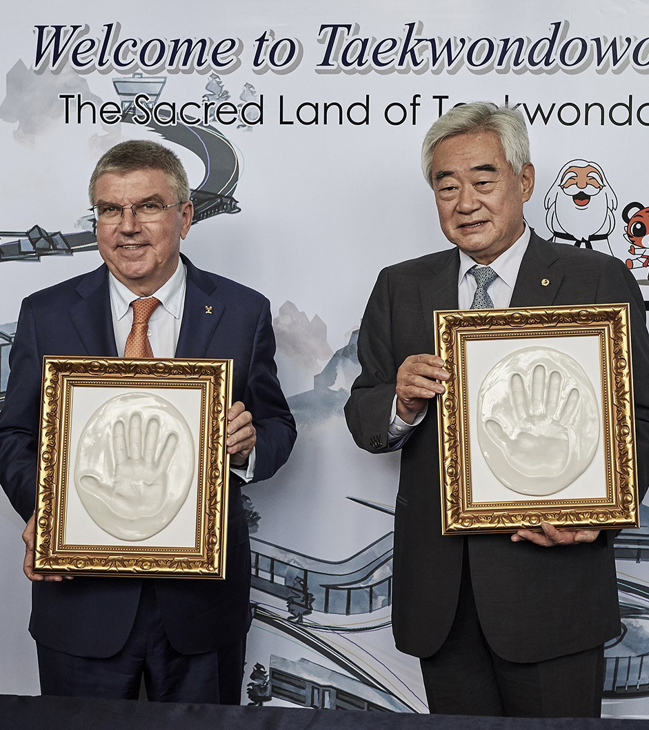 Bach and Choue then donned dobok and, together with other VIPs and IOC members, smashed boards on which were inscribed various social and sportive ills including corruption, match fixing, illegal gambling and doping. The two then left their hand prints for Taekwondowon.