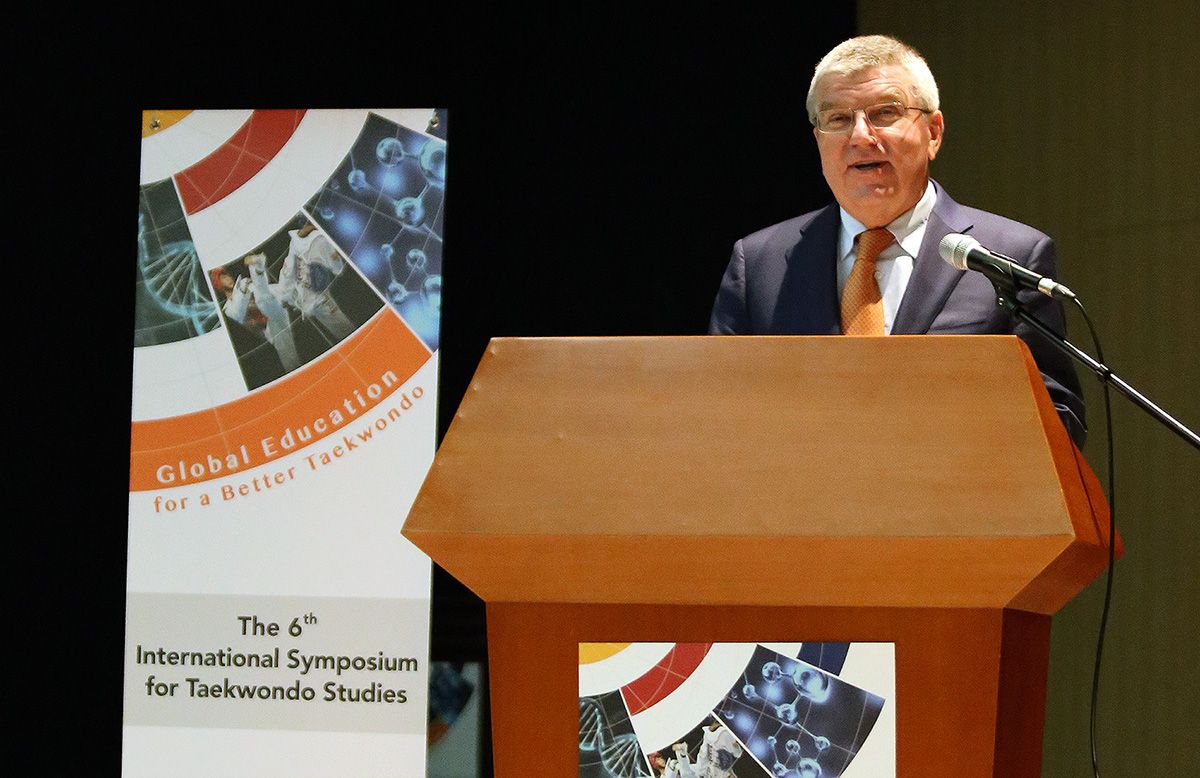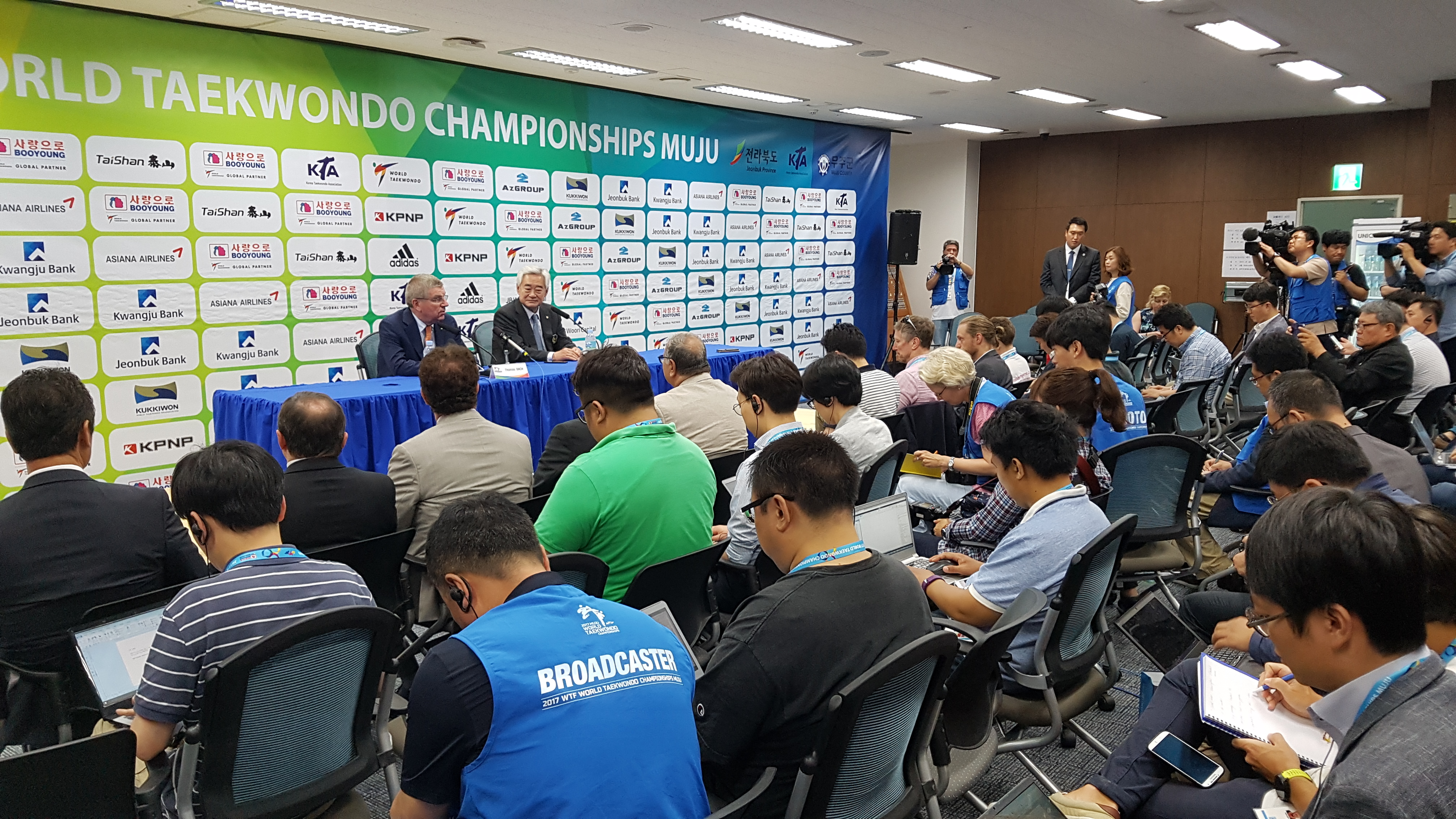 MUJU, Korea (June 30, 2017) – IOC President Thomas Bach visited the 2017 World Taekwondo Championships, where he visited an academic symposium, looked around the facilities at Taekwondowon, presented a IOC President trophy to World Taekwondo President Chungwon Choue and held a press conference.