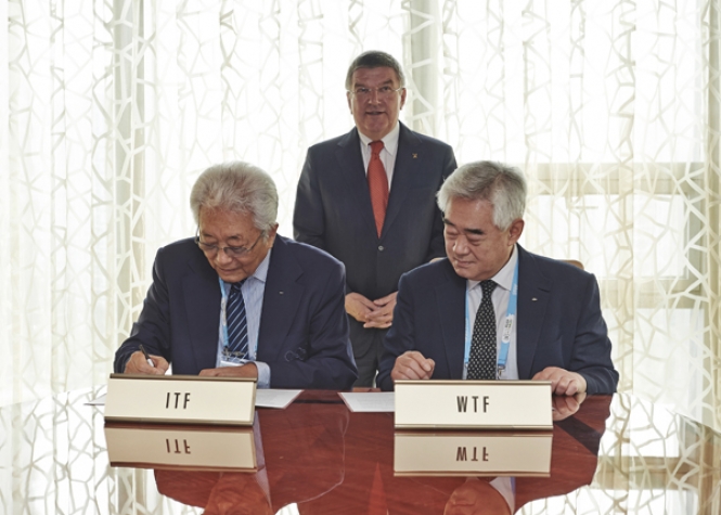 WTF President Chungwon Choue and ITF President Ung Chang signed the memorandum on Aug. 21, 2014 in a ceremony in Nanjing, China during the Youth Olympic Games.