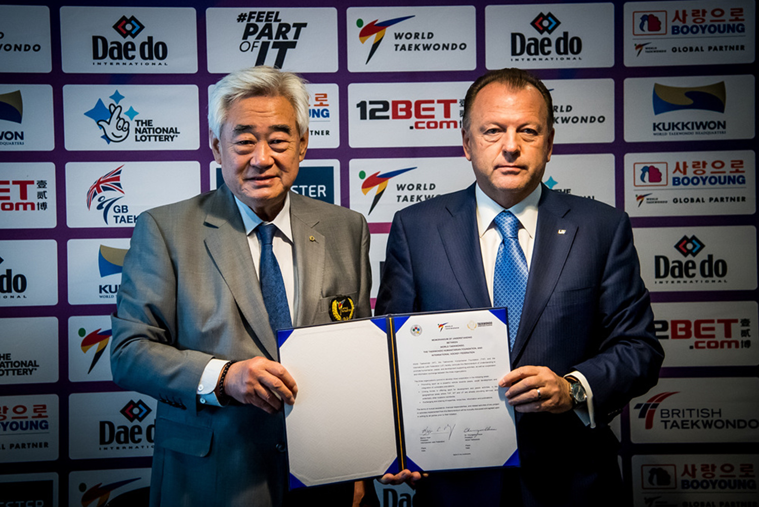 WT President Chungwon Choue (left) and IJF President Marius Vizer during the MOU ceremonyMANCHESTER, UK (May 15, 2019) – World Taekwondo (WT), the Taekwondo Humanitarian Foundation (THF) and the International Judo Federation (IJF) today signed a Memorandum of Understanding (MOU) to promote humanitarian, peace and development activities.