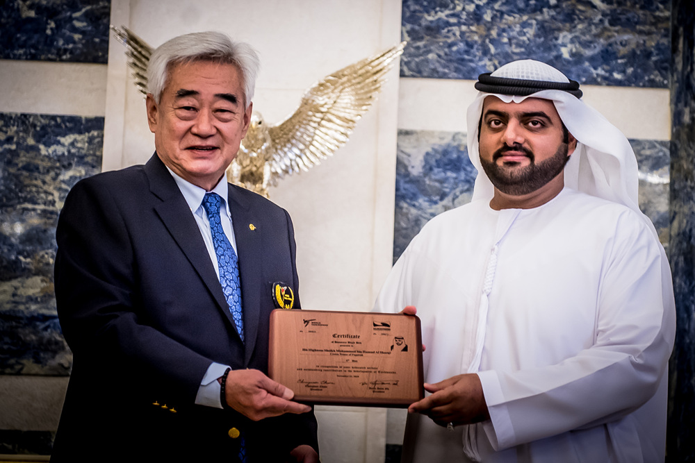 FUJAIRAH, UAE (Nov, 21, 2018) – World Taekwondo President Chungwon Choue presented Fujairah Crown Prince Mohammed bin Hamad bin Mohammed Al Sharqi with an 8th dan taekwondo black belt certificate on a ceremonial plaque at the Rumailah Palace in Fujairah, today.