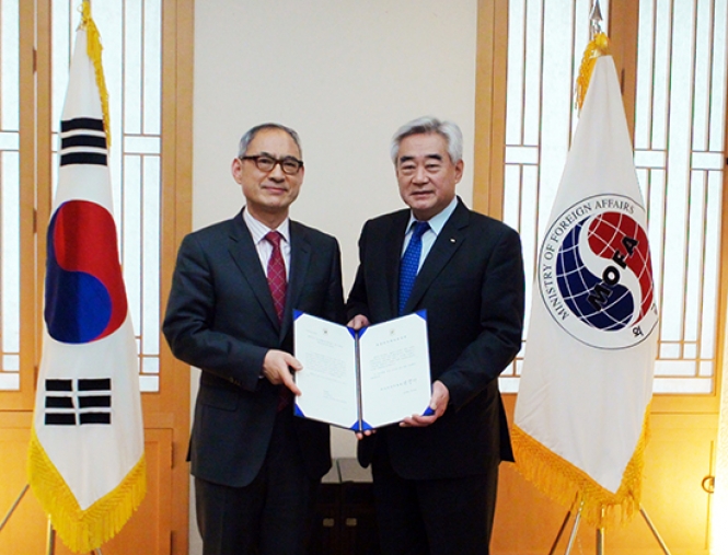 WTF President Choue received a certificate appointing him as an honorary consul of Honduras in Seoul from Jae-hyun Bae, deputy minister and chief of protocol of the Korean Ministry of Foreign Affairs, on behalf of Foreign Affairs Minister Byung-se Yun, in a ceremony at the ministry on April 4, 2013.
